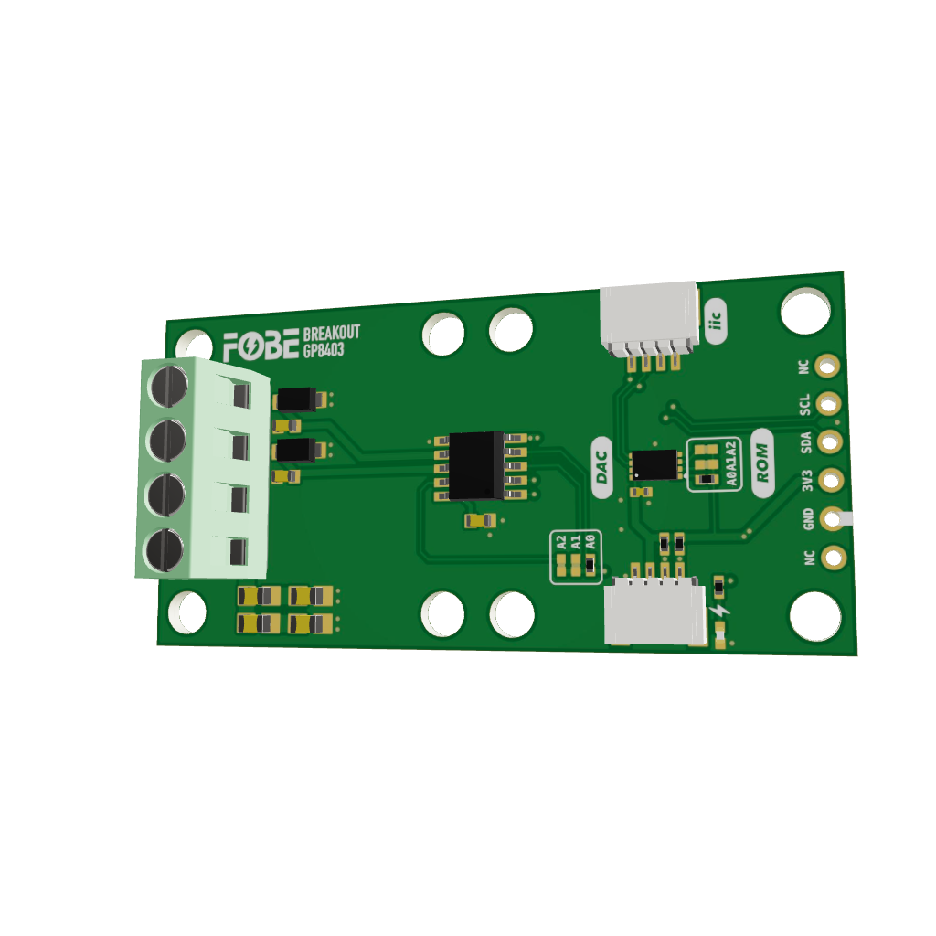The FoBE Breakout GP8403 integrates the Linearin-GP8403 I2C to dual-channel voltage DAC converter and the ST-M24C64 EEPROM for calibration data storage. The module converts 12-bit digital values (0x000-0xFFF) to precise 0-5V or 0-10V analog voltage output with excellent linearity and accuracy. Multiple connectivity options are provided for easy integration into various applications.